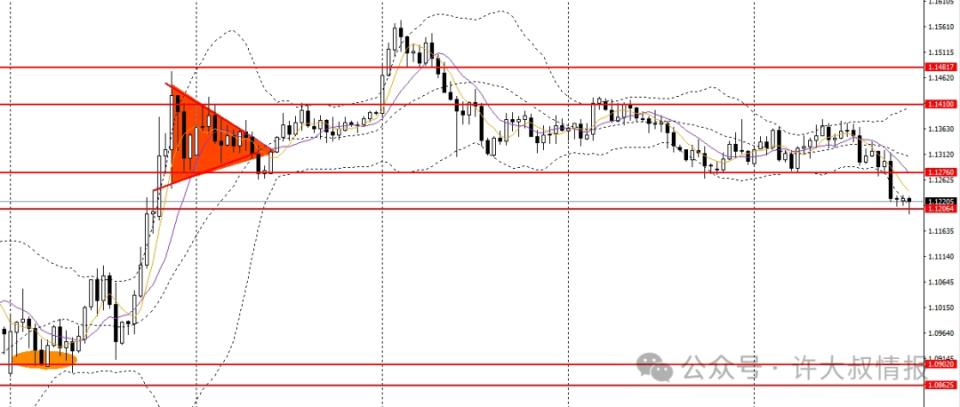 欧美跌破前低,下探日线布林下轨,日线RSI跌至50附近,4小时下破1.1270一线支撑,下方首先关注1.12关口支撑,如企稳,空单可离场,如进一步跌破,可下看至1.1150。