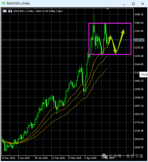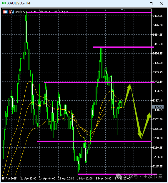 横盘震荡是近期的主基调,美联储利率决议也没能改变这一点。而这轮震荡是日线图中期调整的节奏,预期本周还将继续,不预测这种大区间的突破。考虑到近期热点关税谈判和印巴冲突演变,黄金的整体回调幅度将会受到限制,行情在每天的运行过程中可能出现较大反复。使用说明: