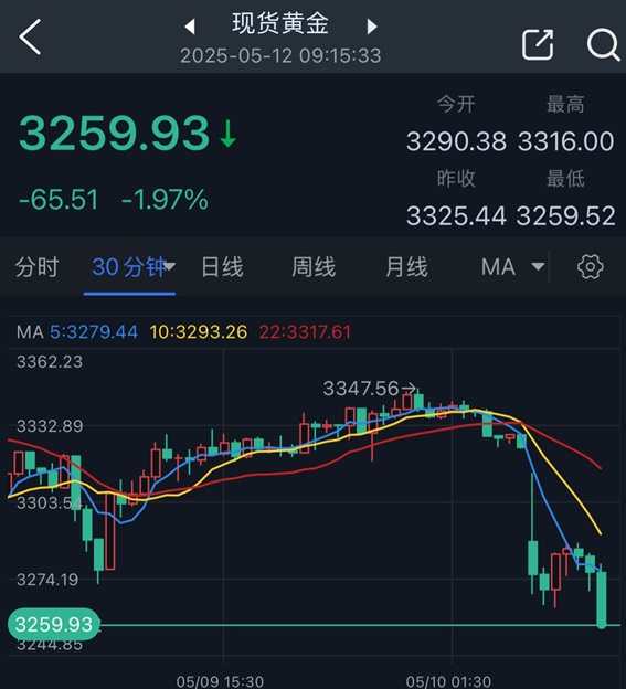 24K99讯 周一(5月12日)亚市早盘,现货黄金延续日内大跌走势,目前金价跌至3260美元/盎司附近,日内暴跌逾65美元。