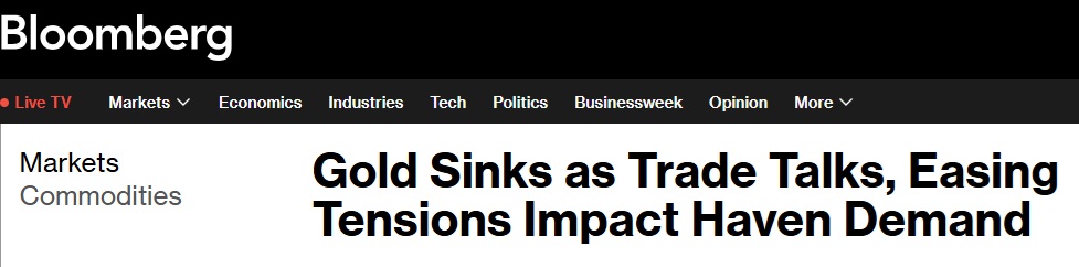 美国彭博社分析称,受中美贸易谈判取得进展的迹象以及地缘政治紧张局势有所缓解的影响,黄金的避险地位受到影响,导致黄金下跌。