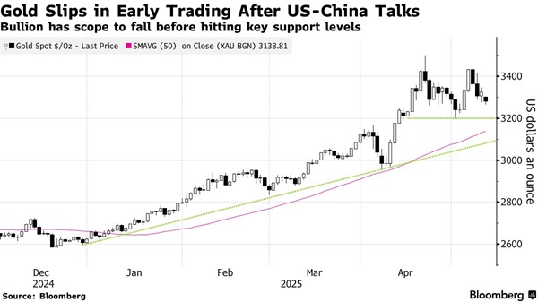 分析师指出,受诸多因素影响,市场避险情绪陡然降温,这令避险资产黄金遭受重创。中美经贸高层会谈达成重要共识,并取得实质性进展,印巴停火协议在周日得以维持,普京提议周四在土耳其恢复俄乌直接谈判,一度推迟的美伊第四轮谈判也开始举行。