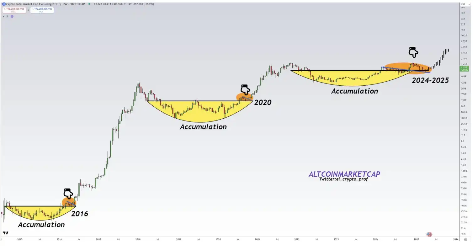 技术交易员 Moustache 也指出,山寨币经历重复积累后常现爆发性增长,认为当前市场结构与 2016、2020 年相似,宣称「2025 年山寨币季节已正式开始」。