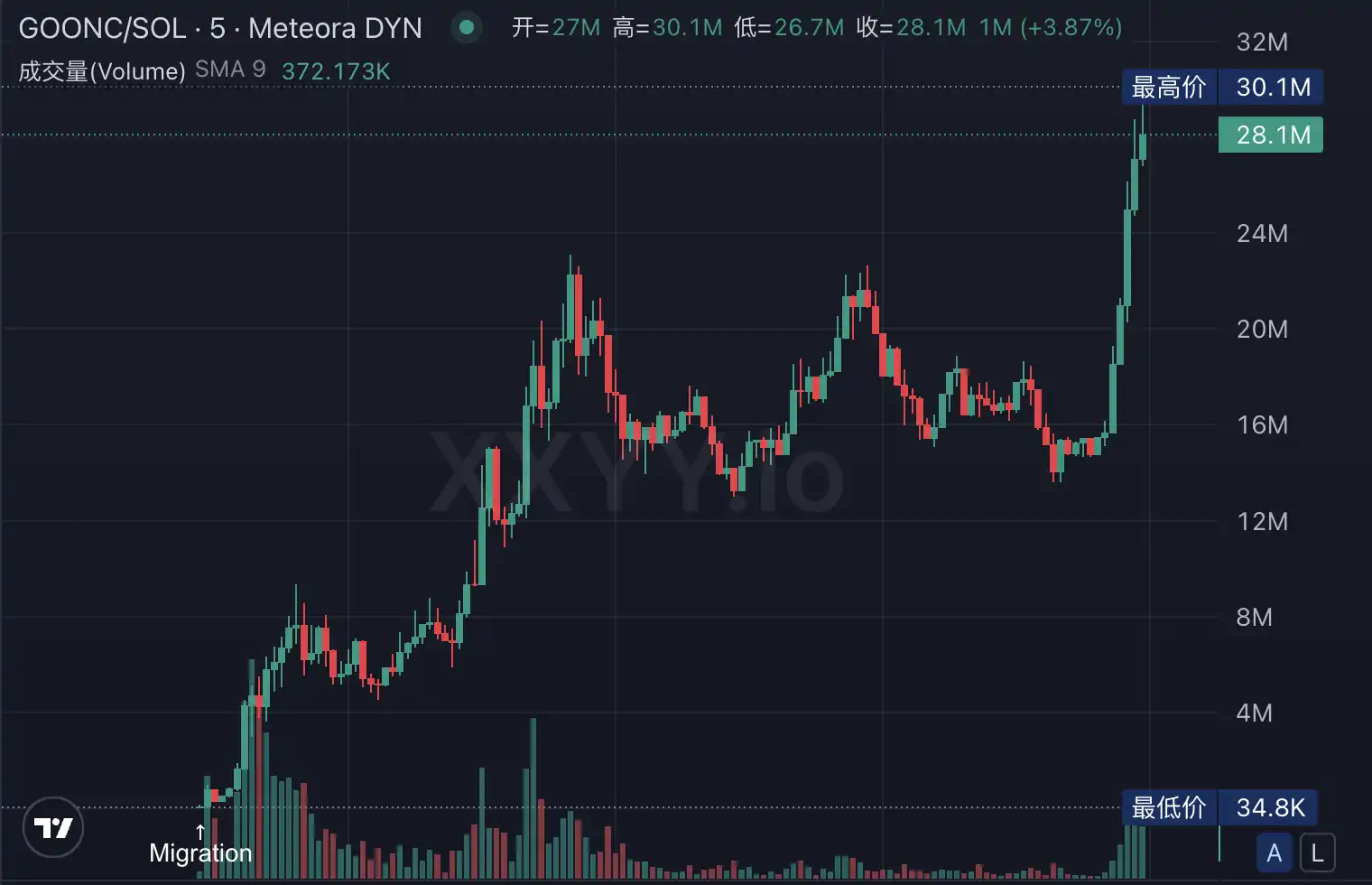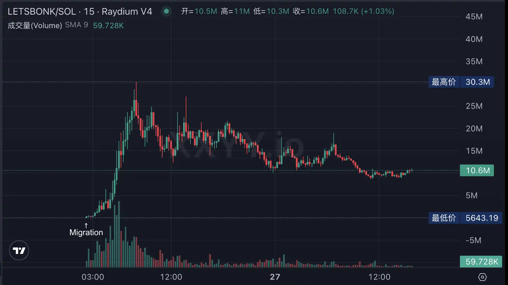 LetsBONK 是与平台 LetsBonk.fun 同名的 Meme,这也是一开始虽然没有特别高的市值,市场中认定他为龙二的原因,在第一波最高达到 50 万美元市值之后,被风头正盛的 DumpFun 吸血一度回归 10 万美元市值。而随着 DumpFun 的 K 线持续走弱,并且越来越多的 KOL、项目方、社区 OG 喊的口号「LetsBonk」,市场的关注度回归$LETSBONK,低开高走,6 小时内暴涨至 3000 万美元市值,这也是 LetsBONK.fun 在发行后打的第一个「百倍币」,至截稿现已回调至 1000 万美元市值。