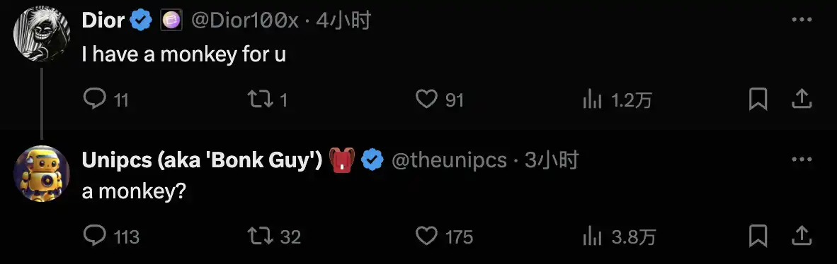 自从 BONKGUY 与华语社区接上线之后,似乎开启了「中文 IP」速通狂飙模式,昨日的 IKUN 市值速通 1500 万美元后,今日链上出现了一个叫 DAZHUANG 的猩猩形象,以与美国副总统万斯的形象相近,充满 Meme 色彩。而市场的 FOMO 超乎想象,光是回复了链上 DEGEN DIOR 在评论区的「我有一只给你的猴子」,DAZHUANG 代币便一路突破 300 万美元。