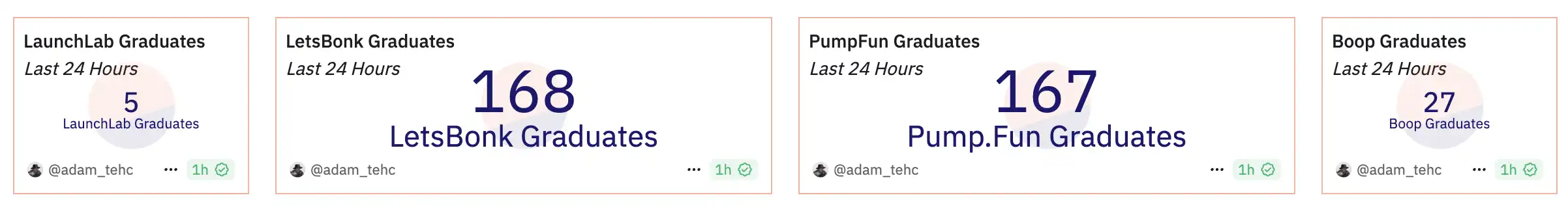 半个月过去了,LetsBONK 的热潮并没有消去,过去 24 小时的毕业代币数量已经超越了 PumpFun,尤其是昨天创始人 TOM 嘲讽 PumpFun「抄袭」LetsBONK 的创作者激励活动后将其 X 账号拉黑的推文后进入了白热化。加之「换皮」归来的 Believe 的参与,这场 Solana 链上「百团大战」逐渐精彩,而无论如何都为链上带来了久违的流动性与更快速的波动性。