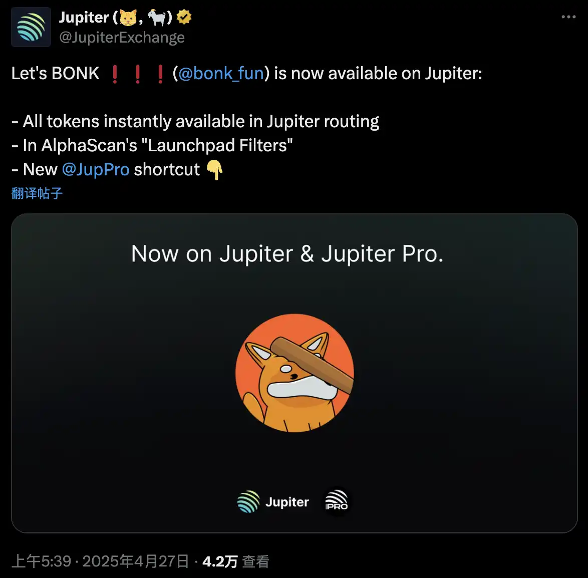BONK 平台的交易手续费有 1%,其中一部分会用 BONKSOL 的节点做验证,并且其中部分会用来回购并销毁 $BONK,这同时也做到了「Reduce Supply」。平台一经推出便受到了 Solana 生态中一众项目方以及 OG 社区的支持,Dex 龙头 Jupiter、加密「Paypay」MoonPay、OG 社区 MonkeDAO「SMB 社区」、Solana 创始人 Toly 等核心圈人物纷纷「发来贺电 LetsBonk」。