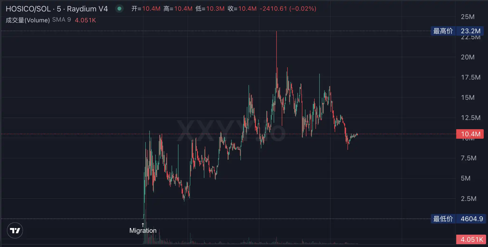 Hosico 原本为 Instagram 上粉丝数量 180 万的可爱猫咪,在 BONK 上发行的 Hosico 是吉卜力 AI 画风的 Hosico,在凌晨 4 点后突袭,1 小时内涨至 1000 万美元市值,而不受其他代币的涨跌影响在 BONK 平台系代币中走出了独立行情,最高达到 2300 万美元市值,现报 1000 万美元。