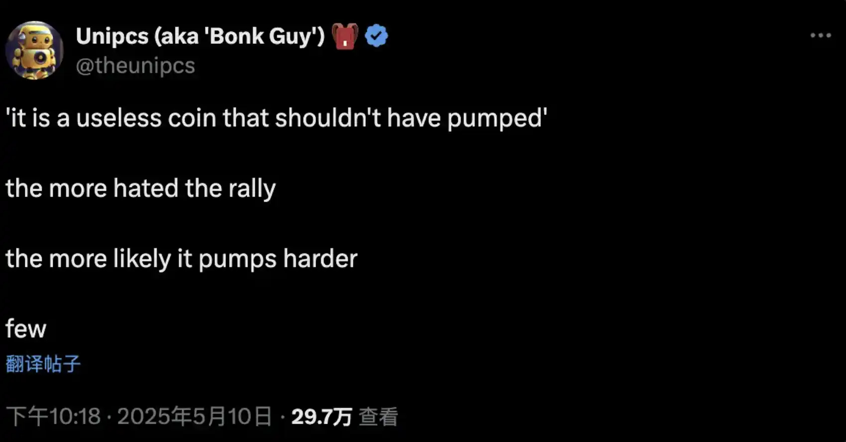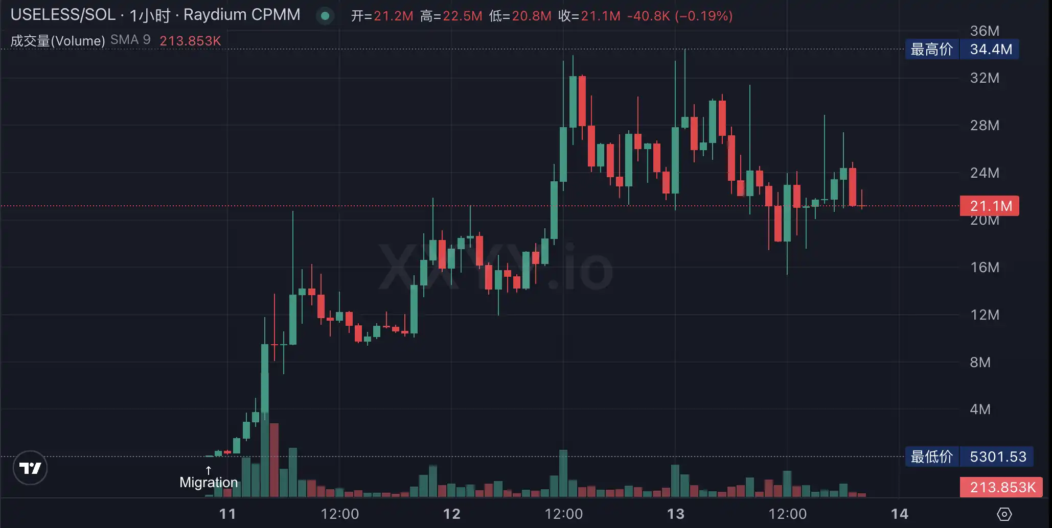 USELESS 来自 BONKGUY 在 X 上发布的一则推文「这是一种无用的货币,不应该被推高」,这种类似于「FARTCOIN」、「SHIT」、「HOUSECOIN」等虚无情绪化概念是欧美社区的钟爱,而自 BONK 发射之后市值一路狂飙至 3400 万美元,现已回调至 2000 万美元。
