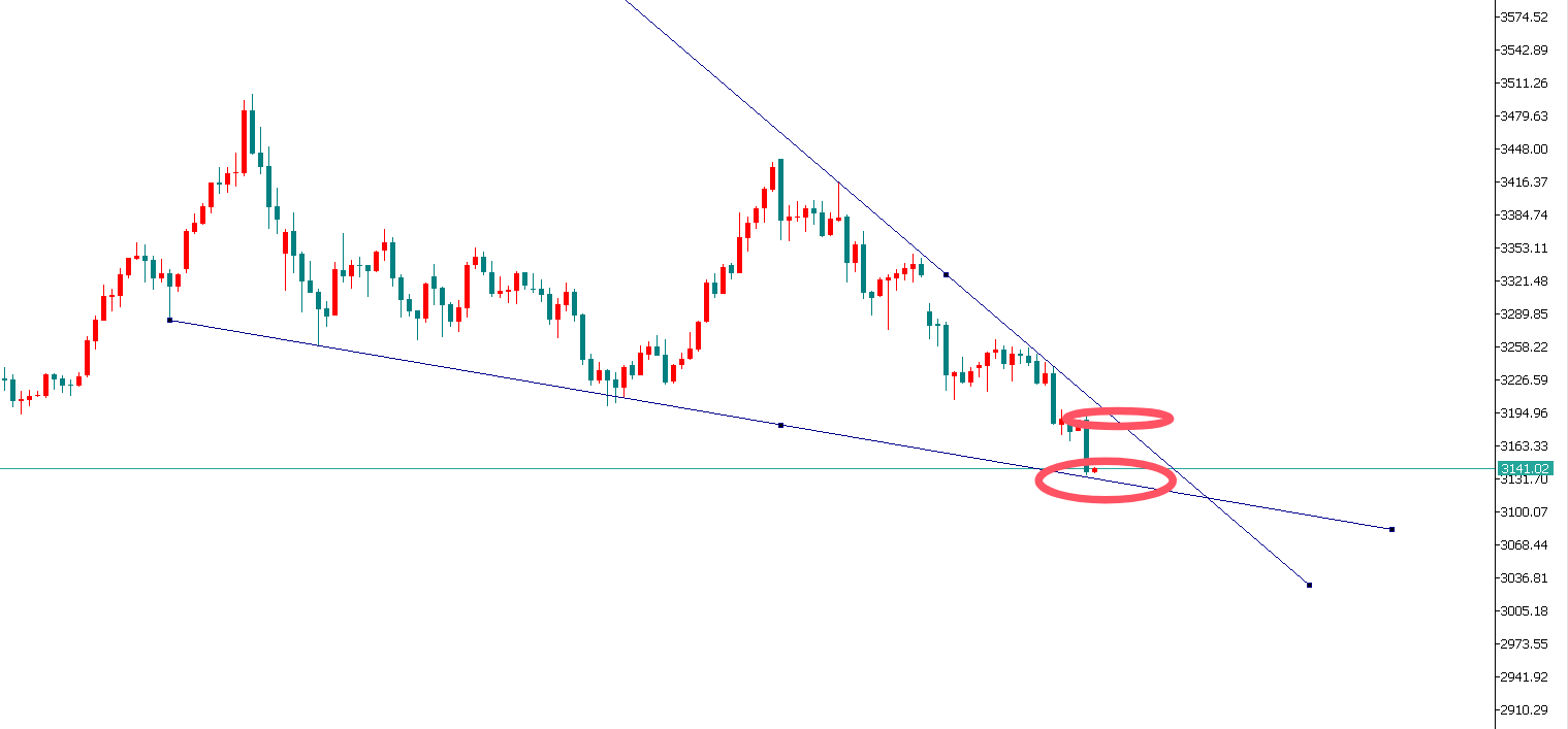 黄金如预期回落,不过空头比我预期的幅度大了些,早盘直接惯性下跌,现在再次临近关键支撑位附近。