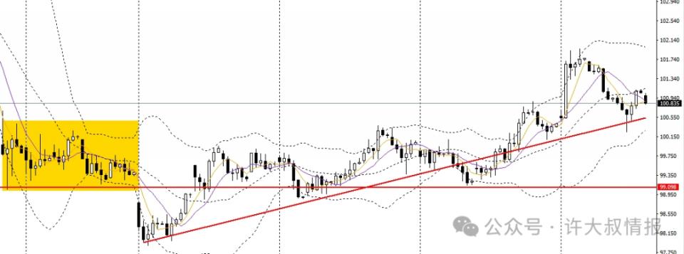 美元指数收锤子阳线,刺破10日均线,日线RSI位于50附近,4小时一度逼近100关口,仍立于上行趋势线上方,短线大概率将趋于震荡,可暂时观望。
