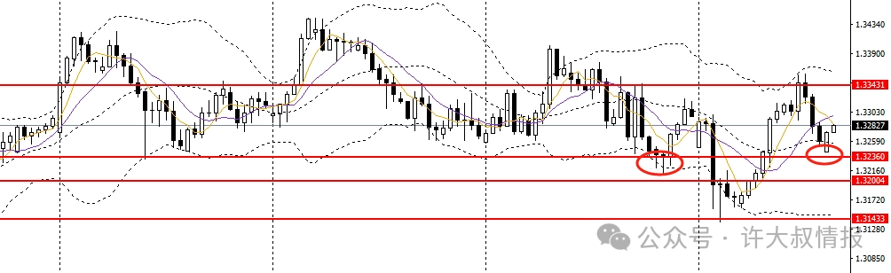 镑美冲高回落,继续徘徊于5日、10日均线附近,1.3340-60仍为上方关键阻力,4小时于1.3240一线企稳,如无法跌破,空单可离场,建议短多,如彻底站上1.3340一线,可看多至1.34。
