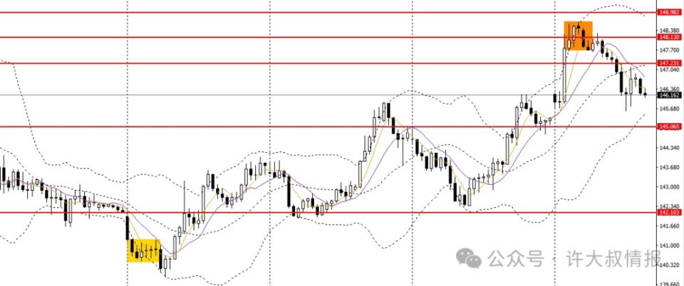 美日延续回落,失守5日均线,4小时空头占优,如反抽至147-147.2一带承压可进空,短线有望进一步下探145一线。