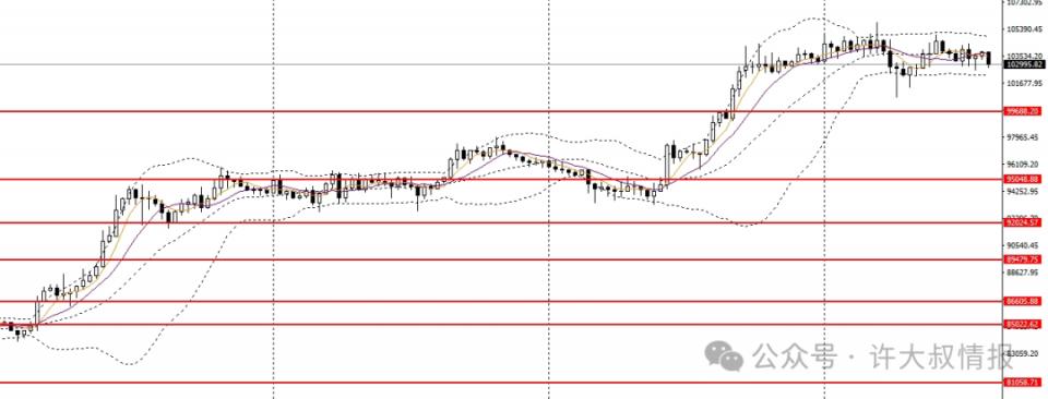 比特币小幅收跌,仍徘徊于5日均线附近,日线RSI自高位回落,4小时未破前高,多头力量减弱,短线不排除将回踩100000附近,可暂时观望。