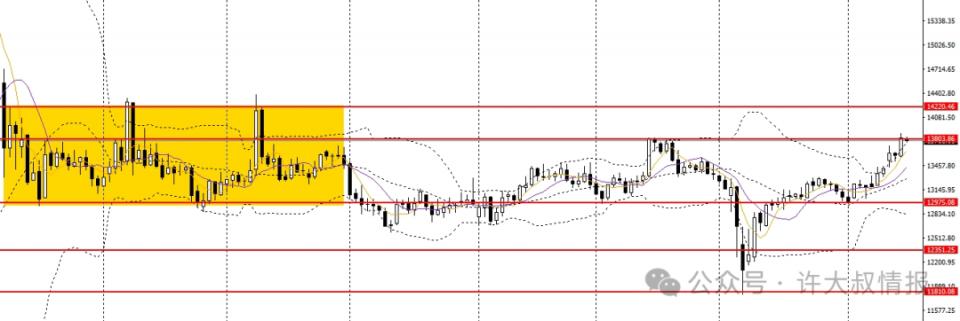 A50日线呈多方炮,日线RSI到达高位,4小时升破13800附近阻力,走势强劲,多单仍可持有,如正式升破13800,可看多至140000附近。