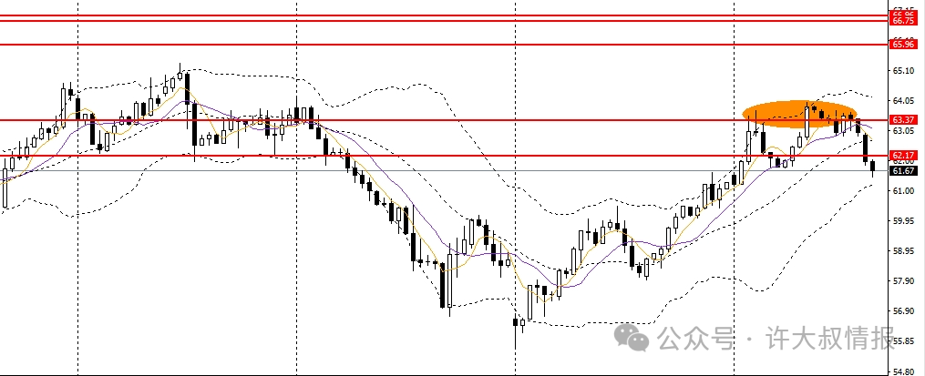 美原油小幅走跌,今日亚盘延续跌势,63附近仍面临强压,日线RSI下破50,4小时呈多重顶,62-63成为上方关键压力带,如无法升破可进空。