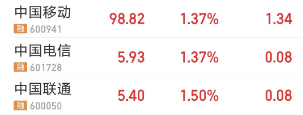 截至午盘,中国联通、中国电信、中国移动均涨超1%。此前,中国联通、中国电信一度涨超3%。