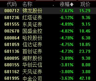 截至午盘,锦龙股份跌超7%,此前一度跌停;红塔证券跌超6%;首创证券、信达证券等5股跌超4%。