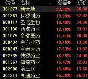 截至午盘,新天地、科源制药20%涨停,圣诺生物大涨18%,西点药业、多瑞医药等涨超10%。