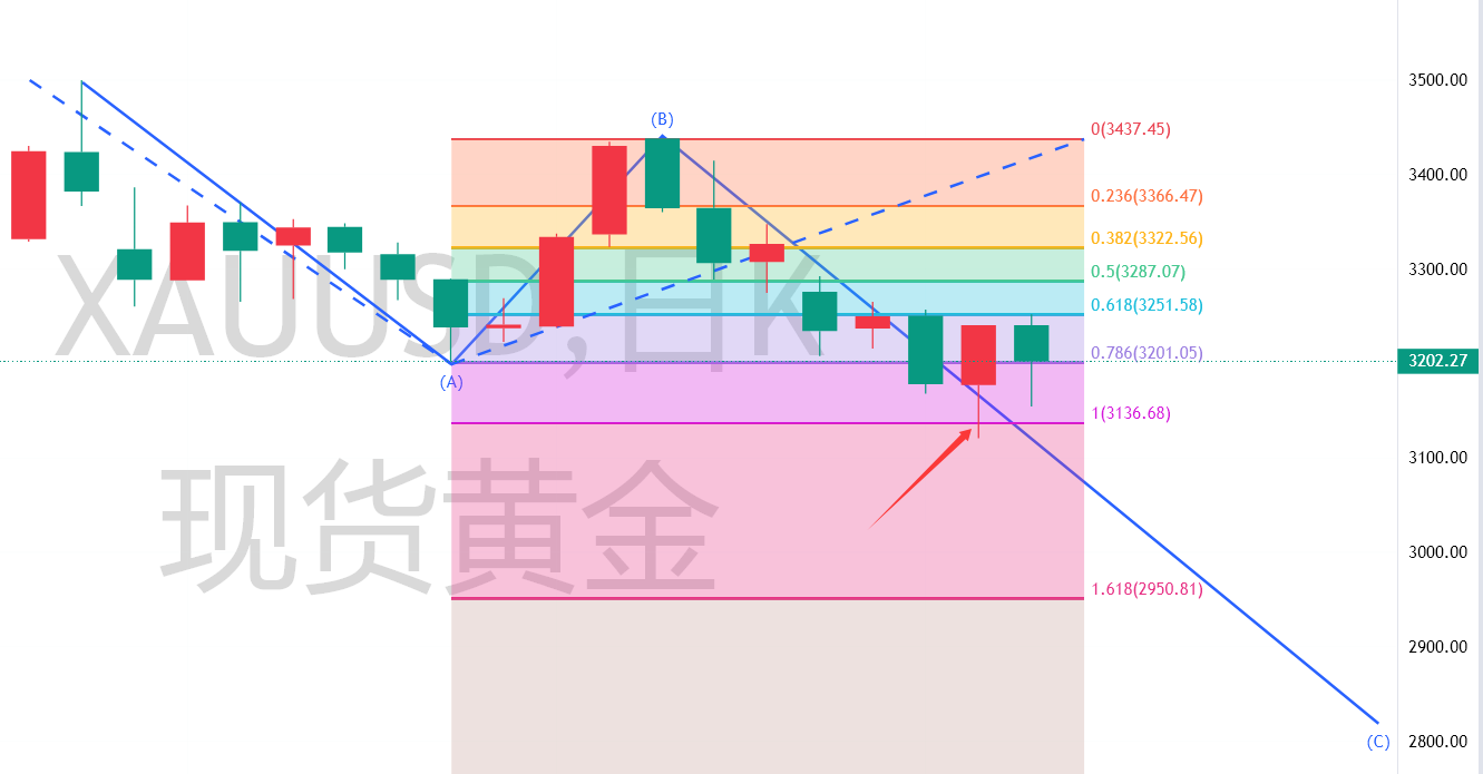 周一的跳空低开以及周三美盘时段金价下破3200美元/盎司的关键动作,为笔者此前关于3500美元/盎司为趋势顶部、C浪即将展开下跌的判断提供了有力支撑。值得注意的是,本周四金价在触及3120美元/盎司低点后出现反弹走势,但反弹幅度有限,未能突破本周上半周的高点。因此,此次反弹可视为金价大幅下跌后的技术性修正。周五的市场走势进一步验证了这一观点,亚盘时段金价延续下行态势,随后受周线收盘因素影响,部分多头头寸获利了结,推动金价尾盘反弹,最终在3202美元/盎司附近收盘。