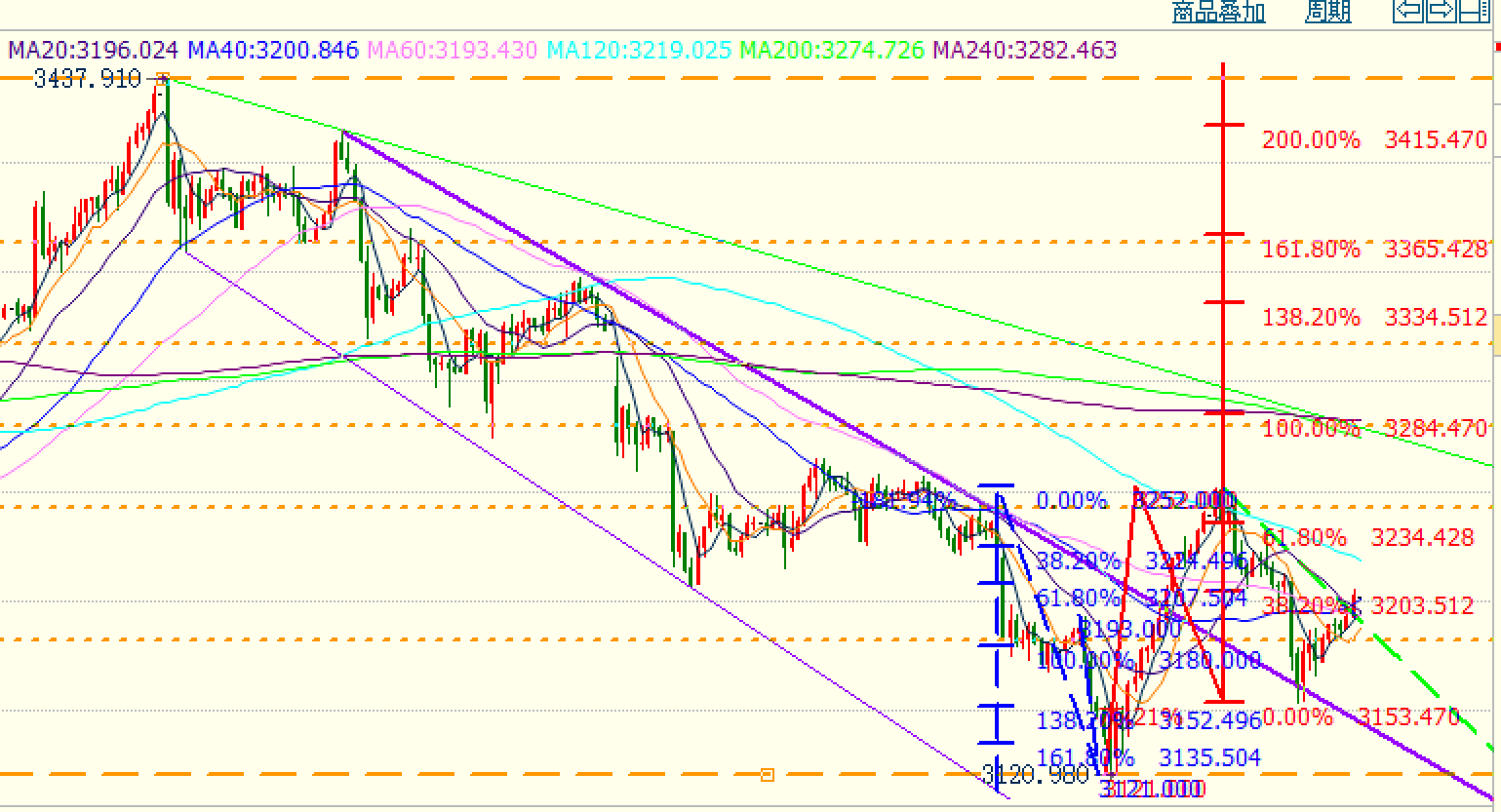 阻力重点3265-70区域,短期则3220-25及3250-55区域;周五收盘来看,日线属于下探回升,如果向上突破3265-70区域,则逐步看涨3293-3300及缺口回补然后3345-50,并且不排除再次测试3400大关。本周周线大阴线,且消息较多;所以,在看涨的同时提防冲高回落,重点3120-25及趋势支撑和3080-85,短期支撑3180-85区域及3155-60!操作上,逢低买入多单为主,拉高重点阻力区域一样可空!