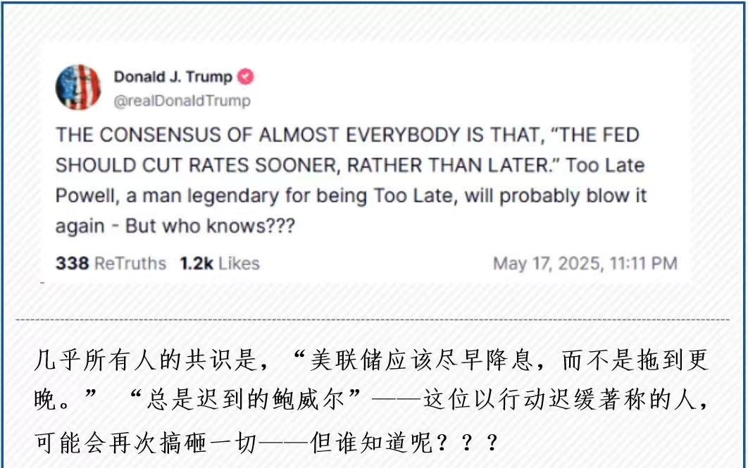 2、特朗普继续逼迫美联储降息,当地时间周六(5月17日),美国总统特朗普在其社交平台“真实社交”上发帖称:“几乎所有人的共识是,‘美联储应该尽早降息,而不是拖到更晚’。‘总是迟到的鲍威尔’——这位以行动迟缓著称的人,可能会再次搞砸一切,谁知道呢?”