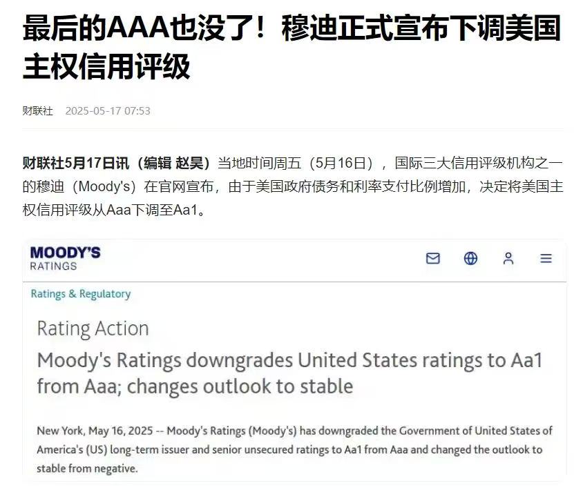 1、美国评级遭下调,国际信用评级机构穆迪5月16日宣布,由于美国政府债务和利率支付比例增加,该机构决定将美国主权信用评级从Aaa下调至Aa1,同时将美国主权信用评级展望从“负面”调整为“稳定”。