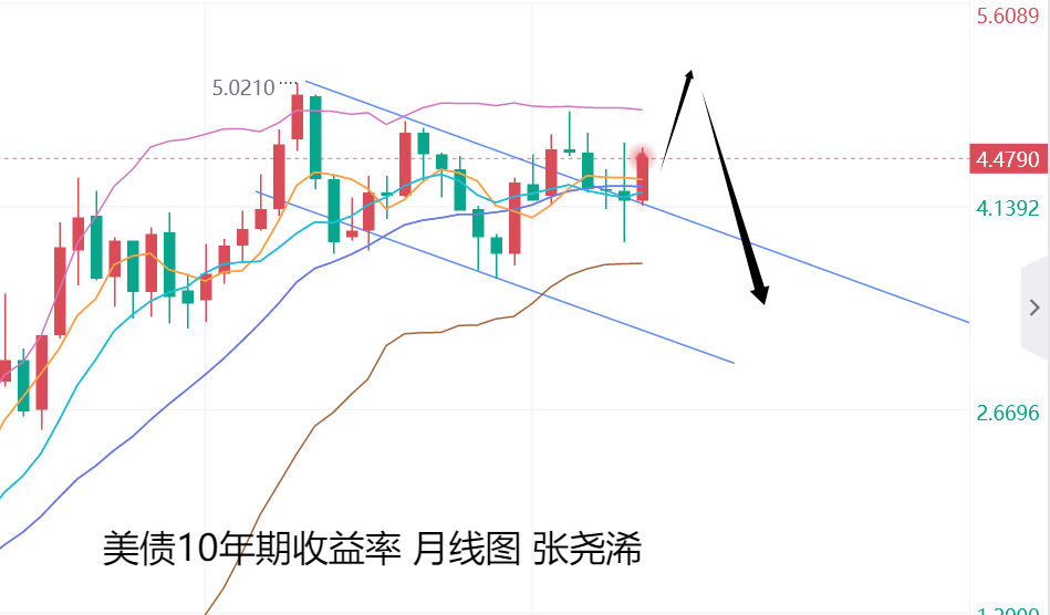 美债10年期收益率,日图及周图处于偏强上行的预期发展,但月图的2年背离行情,则暗示如有进一步走强,也需关注突破新高后的见顶转持续走低的预期,而也会再度支持金价持续反弹。