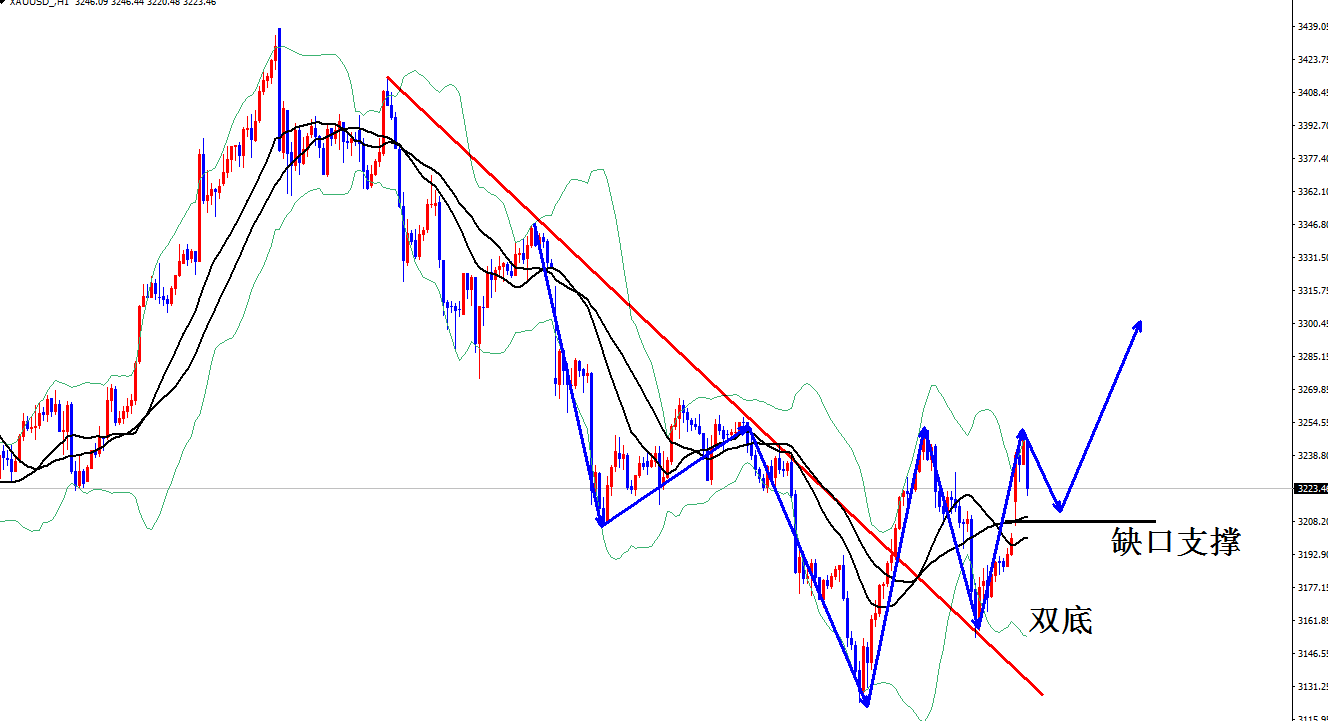 跌不下去,黄金就要再次上涨。关税和谈周期金价都跌不破3100,现在川建国又开始BB关税,黄金能不涨吗?技术上黄金已经完成两次探底回升,双底结构坐实。3200重要压力位已经被踩在脚下,黄金多头随时会将金价推向历史高位,总之,回撤就是做多的机会。