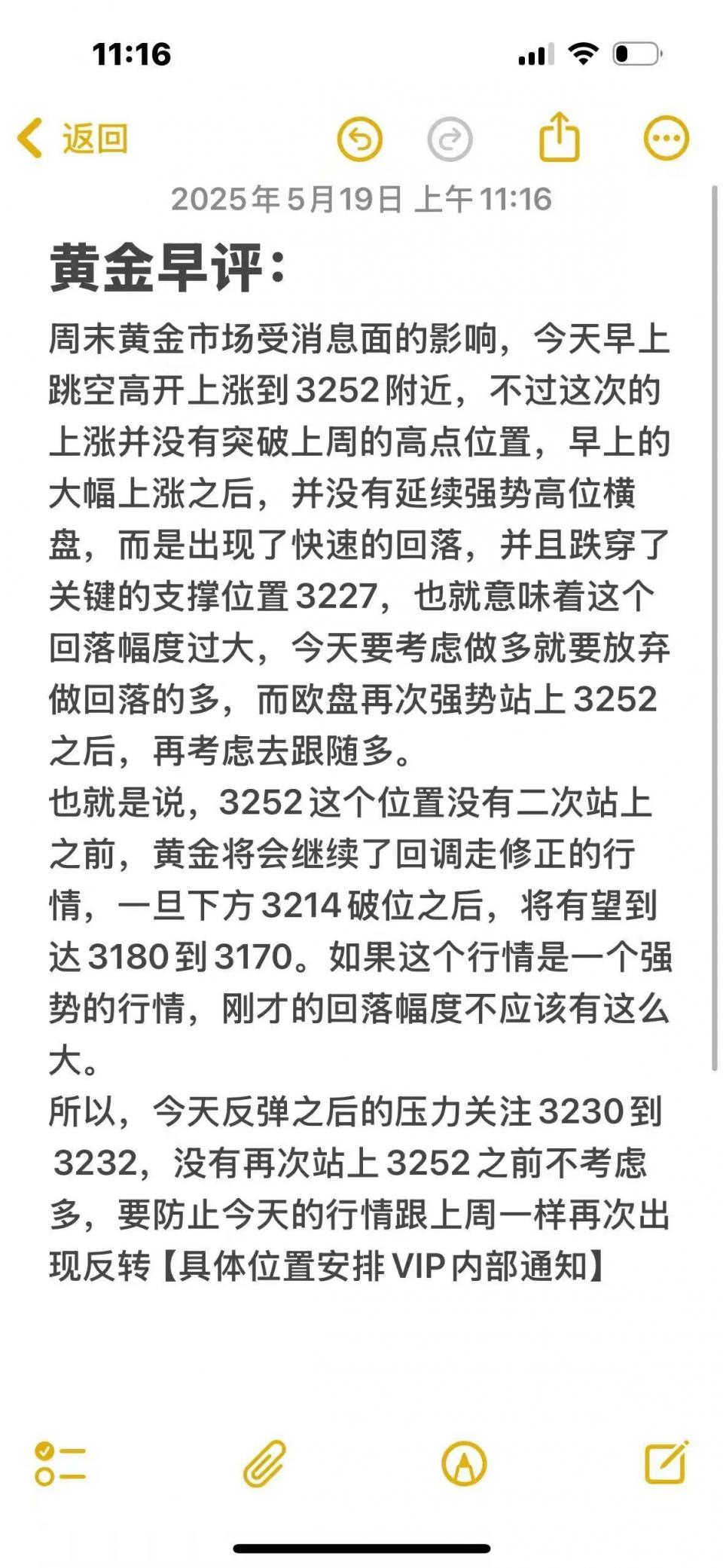 另外,每天早上我会发一个早评,时间大概是10:00~11:00左右,从盘面讲一下我对当日方向的理解以及看法,比如上周五面对上周四的强势拉升,而我在《黄金,切勿追涨杀跌!》明确指出反弹3228-30空,因为早上回落幅度过大,上涨力量有所匮乏。