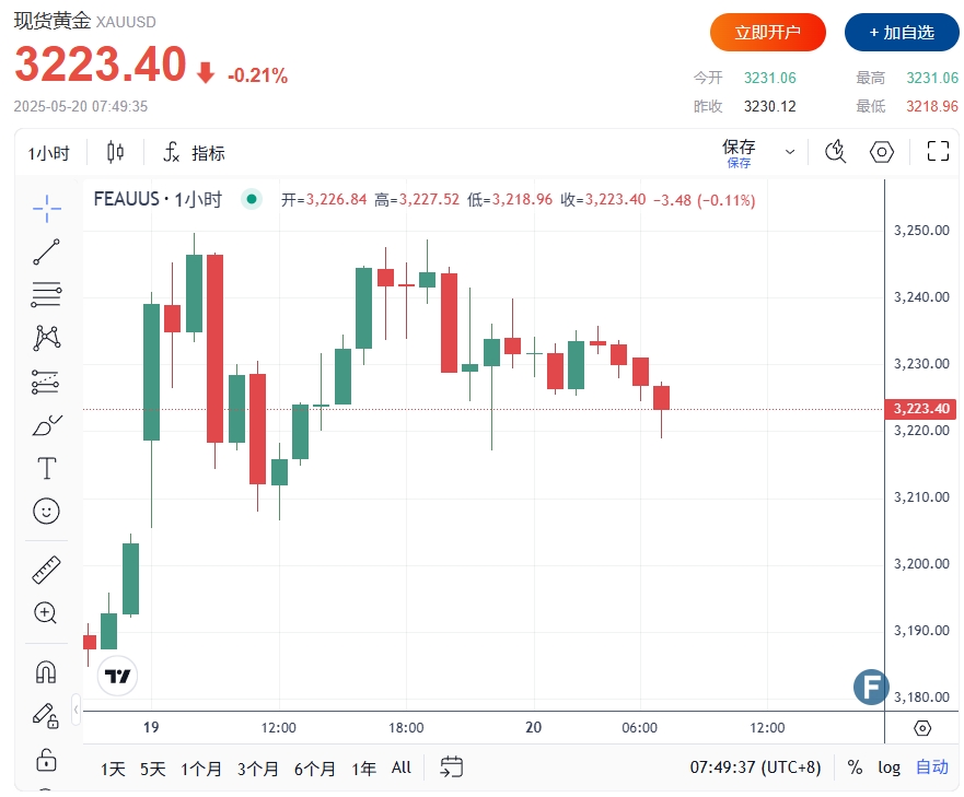 24K99讯 周二(5月20日),黄金回落3223美元再现空头趋势,避险买盘降温。美国总统特朗普与俄罗斯总统普京通话,特朗普表示,俄罗斯希望与美国达成大规模贸易协议,且将立即启动与乌克兰的停火谈判。美联储主席鲍威尔讲话前,央行官员保持观望,夏季降息可能性极低。