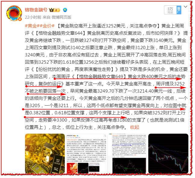 【格物金融】黄金上涨测试3252展开区间震荡,继续关注其攻守