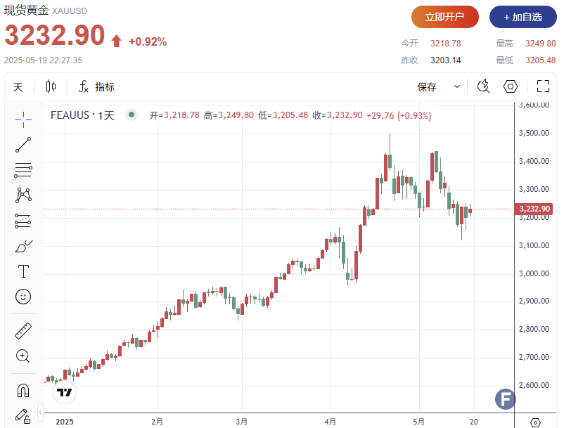 周一(5月19日),因美元走软及避险情绪升温,国际金价大幅上涨逾1%,此前穆迪下调美国主权信用评级,加剧市场对债务风险及贸易摩擦的担忧。