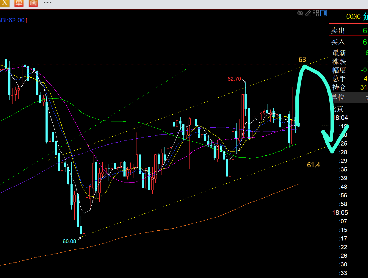 原油方面:当前运行于另一个震荡慢上行通道,不过它属于下降旗形,最终应该会向下破位;因此,倾向于63上轨阻力之下逢高震荡看跌,支撑61.4,有效破位则延续下滑;