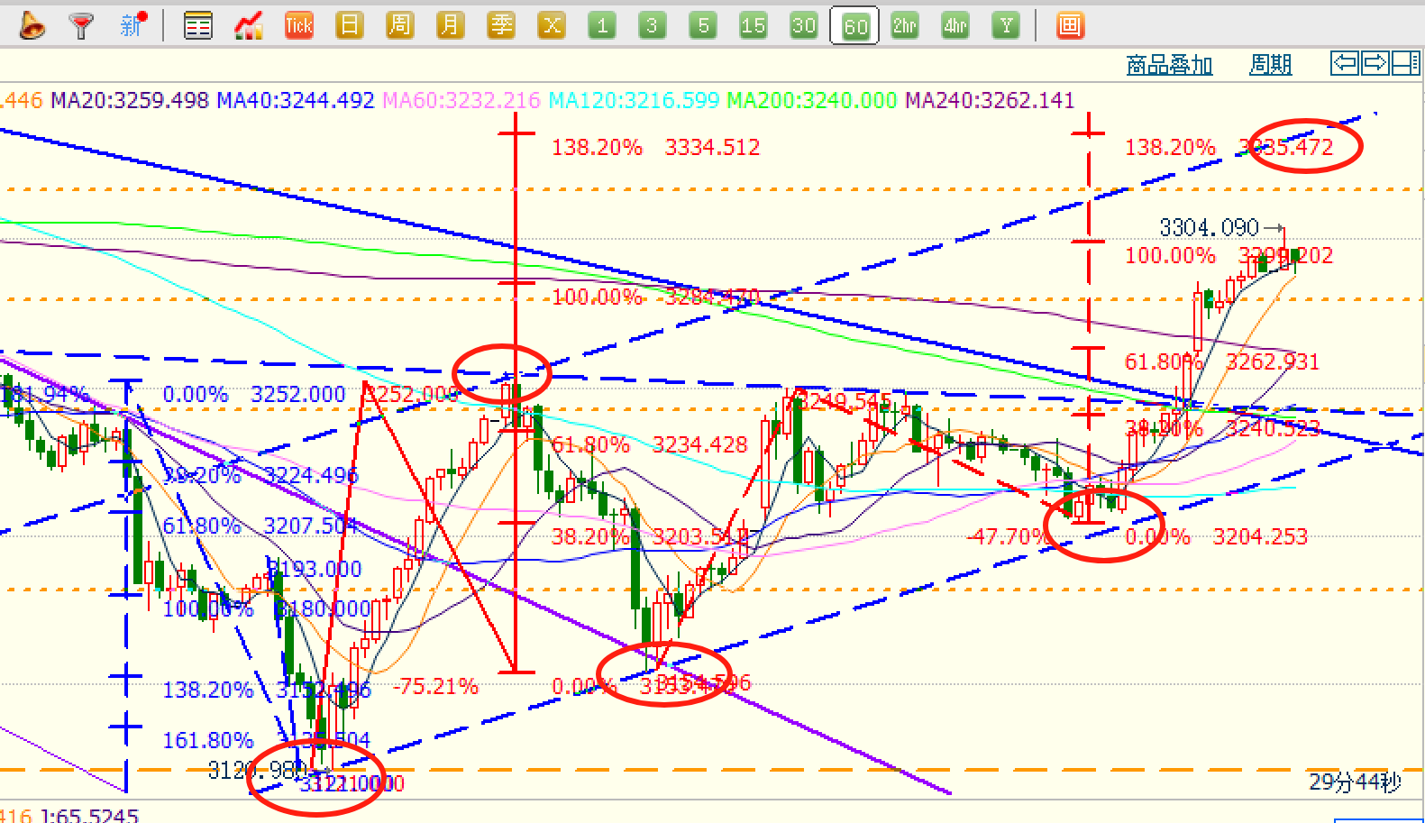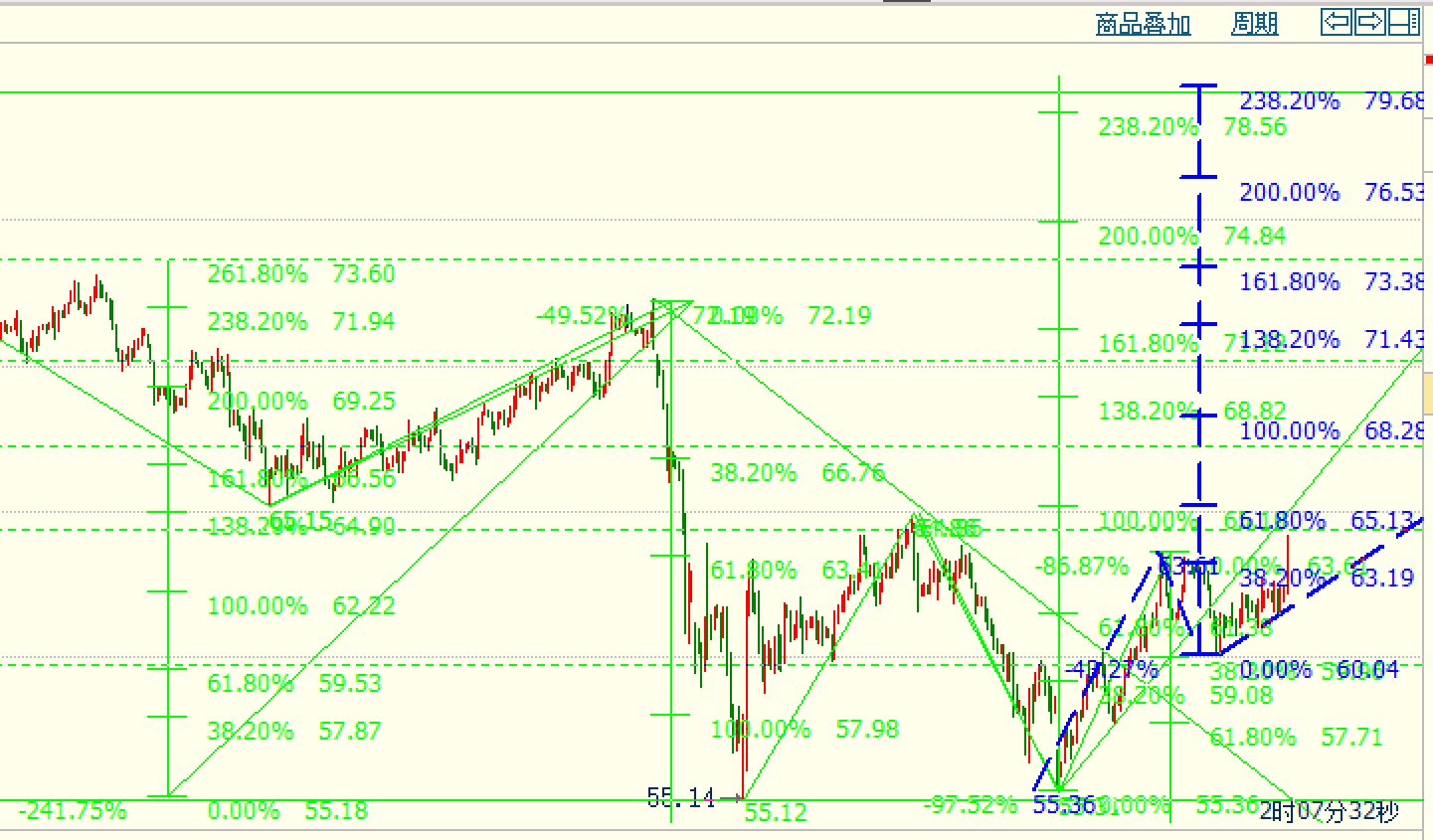 美原油,55双底大涨63以上后,短线如期回落后61区域再次企稳并上涨冲击64一线,当前调整修正。