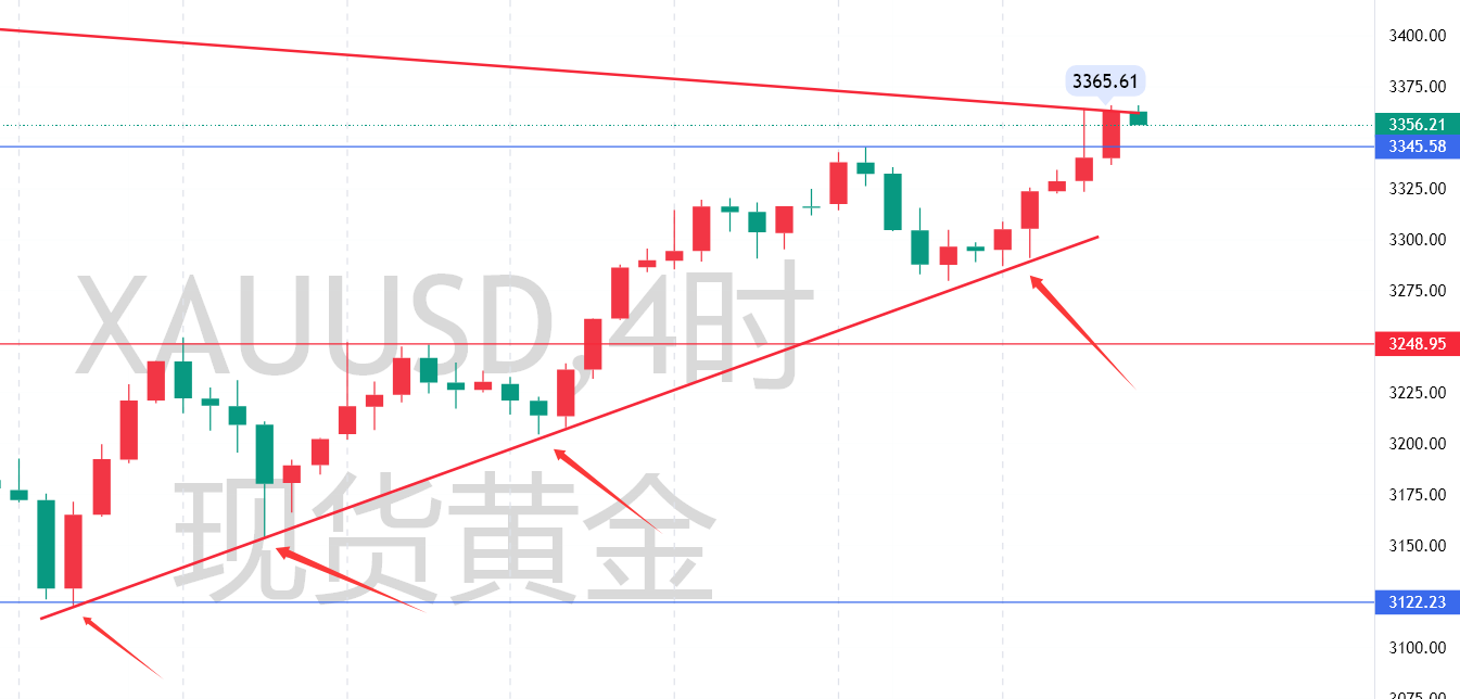 短趋势上,首先看四小时级别,在上周穆迪下调美国信用评级之后,金价自3122到3153与本周3202再加上周四的3278的低点构成一个上行趋势线,周五的关税威胁助攻,令金价上行到3365后轻微回调收盘,下周主要关注这个三角区间的运行情况。小时级别上与四小时信号类似,不做过多赘述。