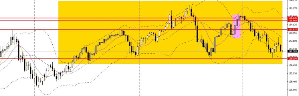 美日上周延续阴跌,承压于5周均线,波段仍处于此前震荡区间内。周五大幅下挫,4小时呈自由落体,143成为上方第一强压,如无法升破了继续进空,如下破142.8,短线不排除将下探142。