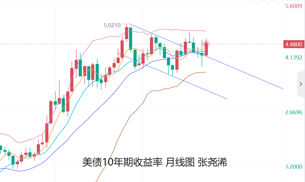 美债10年期收益率,日图及周图短期前景偏强,但依然处于2年周期的宽幅振幅区间内,对金价影响有限,月图的背离走势,则仍暗示后市有望冲高后转持续回落的前景,而会对金价造成趋势性的支撑,因而,金价后市也仍有一波牛市行情。