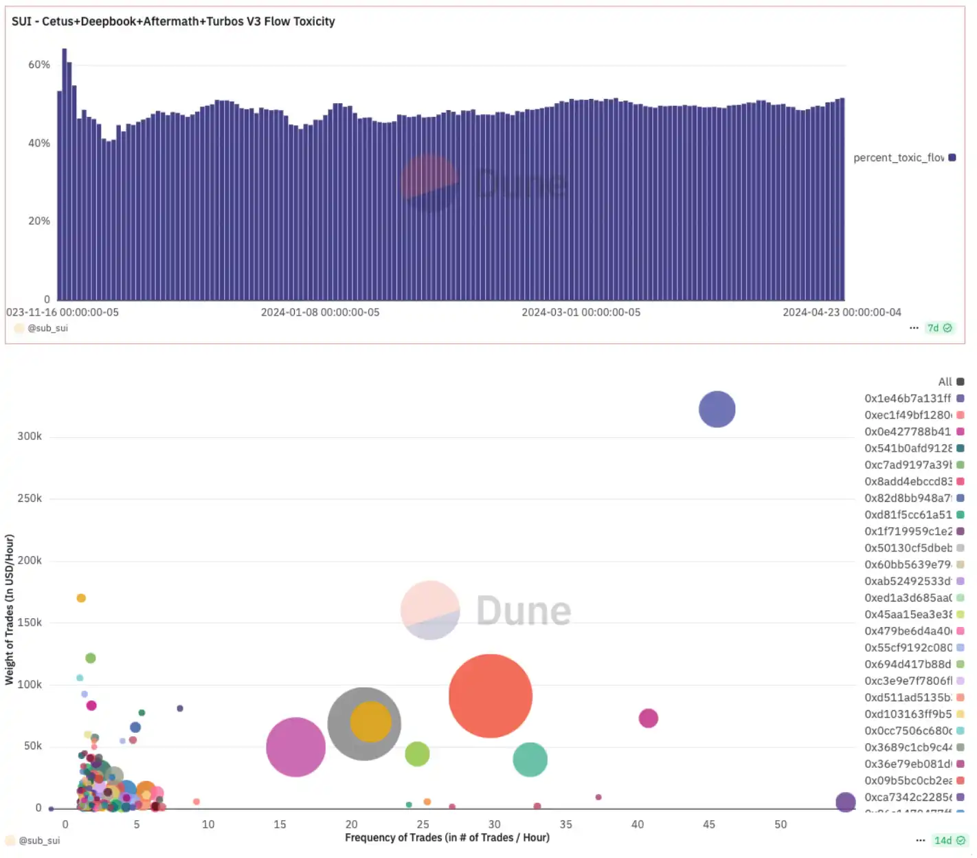 然而有趣的是,根据 Dune 数据显示,Sui 链上一直存在大量刷量交易(Wash Trade),生态流动性毒性(Flow Toxicity)长期接近 50%,这也是社区反馈 Sui 生态「什么东西也没有,就是价格一直涨」的部分原因。
