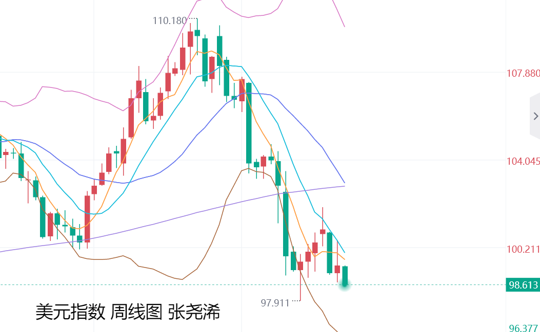 其日图走势,近日持续运行在中轨及短期均线下方,布林带开口向下延伸,附图指标也维持空头信号发展,暗示后市前景偏弱,走势将继续看空,而会支持金价。另外,周图走势也是如此,之前的反弹未能突破持稳5-10周均线阻力,并重回其下方运行,空头前景加强,月图走势也如期遇阻再度走低,继续等待回落下探93目标,而会持续支持金价。使金价其再度上探3500美元,或更高位置。
