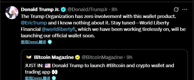 旋即 2 点 18 分,特朗普长子,WLFI 联创 Donald Trump Jr. 于 X 发文澄清称,「特朗普集团与此钱包产品(Magic Eden 与 TRUMP Meme 合作开发)没有任何关联。Eric Trump 和我对此一无所知。请继续关注——我们一直在努力推进的 World Liberty Financial,将很快推出我们的官方钱包。」