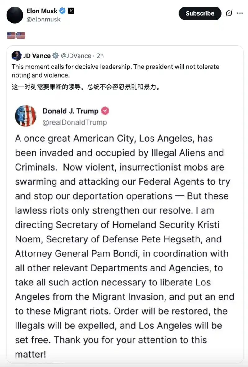 「特马斗」事件的最新进展是,马斯克与特朗普再度成为盟友,这次二者将矛头共同指向了近期发生了骚乱的加州,尤其是洛杉矶。在加州洛杉矶发生大规模骚乱之后,特朗普第一时间在 Truth Social 平台发声,随后美国副总统万斯在 X 平台转发了该言论,并表示:「这一时刻需要果断的领导。总统不会容忍暴乱和暴力。」马斯克随后快速跟帖转发,并配上了「」的标志。