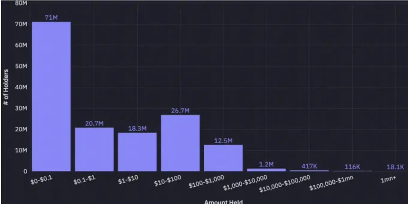 尽管未标记钱包数量庞大——超过 1.5 亿个——绝大多数余额微不足道。超过 60% 的未归因钱包持有少于 1 美元的稳定币,持有超过 100 万美元稳定币余额的钱包少于 2 万个。