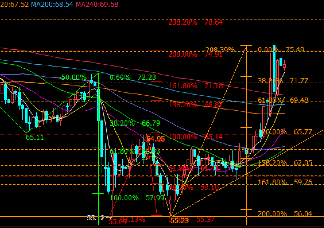 周一周二大涨大跌后,昨日窄幅波动。今日继续关注高位运行,阻力75.5,然后77区域,支撑73和71-70区域,高抛低吸,不追单。上方77-76.5区域多空关键!