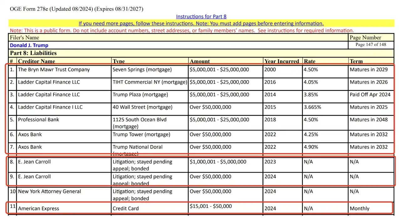 此外,特朗普的财务文件中还提及了自己的 11 负债,其中包括: