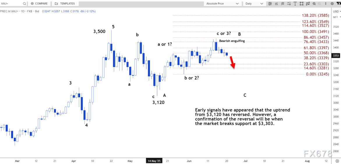 早期信号表明,自 3120 美元以来的上涨趋势已经逆转。然而,只有当市场跌破 3303 美元的支撑位时,才能确认逆转。