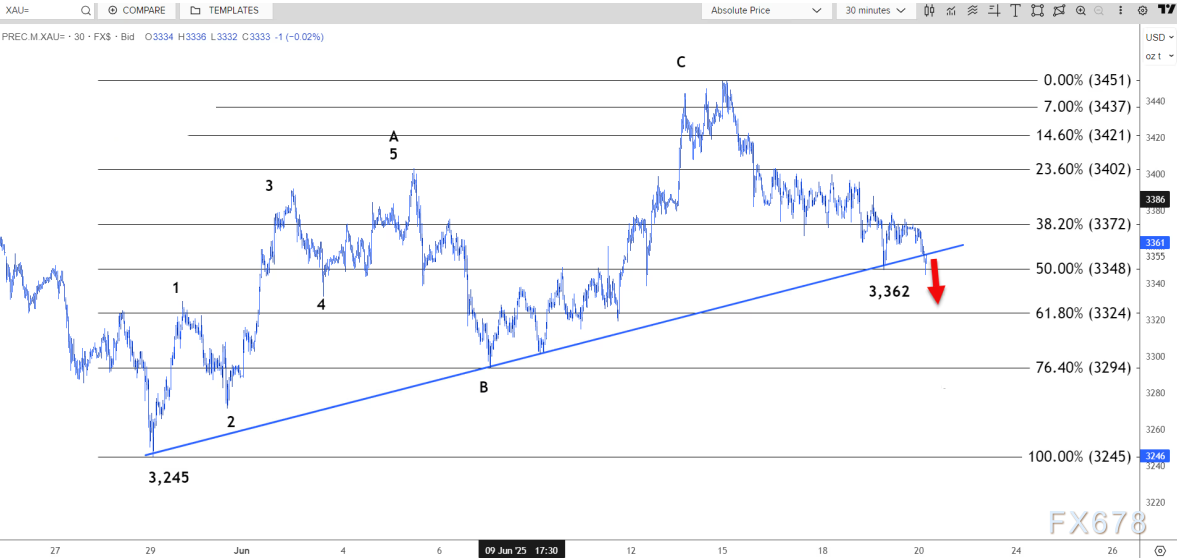 阻力位在3372美元,突破该阻力位可能上涨至3402美元。日线图显示,自6月13日至6月16日形成看跌吞没形态以来,市场持续下跌。