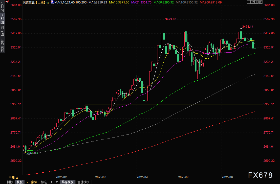 从技术面来看,金价在3300美元和3250美元附近获得较强支撑。Peter Grant表示,这两个价位为金价提供了重要的缓冲区。尽管短期内金价因避险需求减弱而承压,但中东局势的不确定性可能限制其进一步下跌的空间。如果停火协议意外破裂,避险买盘可能迅速回流,推动金价反弹。此外,市场对美联储降息预期的调整也将继续影响金价走势。若9月降息预期进一步巩固,金价可能在低位企稳并尝试上行。