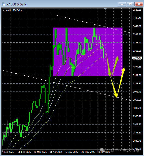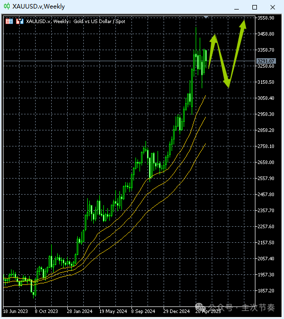 周线图收出黄昏之星K线组合,这是一个即将高位回调的强烈预警信号。在整个技术分析的逻辑体系中,k线组合属于局部信号,不改变方向。所以周线图首先还是要注重均线系统的客观涨势不变,局部信号引起的只是回调,而不是反转。预期在接下来几周黄金以回落调整为主,节奏上可以是快速大幅度回调,也可以是高位的反复震荡向下回调,这取决于多方获利盘的出逃意愿大小。最终这只是一轮回调,不影响整体涨势。Update: 2025-6-1
