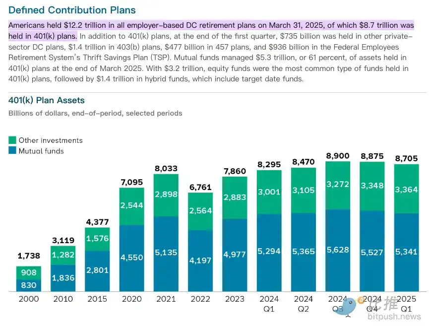 具体而言,根据公开数据,截至 2025 年 3 月 31 日,所有雇主主导的缴费确定型(DC)退休计划总资产已高达 12.2 万亿美元。其中,最受瞩目的 401(k) 计划持有 8.7 万亿美元。