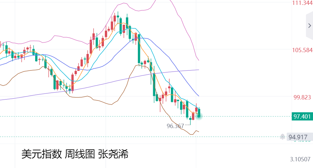 美元指数,日图已初步跌至短期均线及中轨线下方,空头力量有所加强,虽早盘有所止跌,但力度也是有限,整体趋势依然偏弱,周图也再度走低,使得布林带预再度向上延伸,看空前景加大,故此将会在后市继续支持金价反弹。